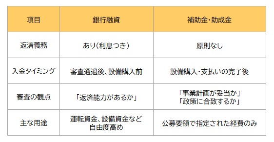 銀行からの融資と補助金の最大の違いは「返済義務の有無」です。補助金は借金ではないため、受け取ったお金を