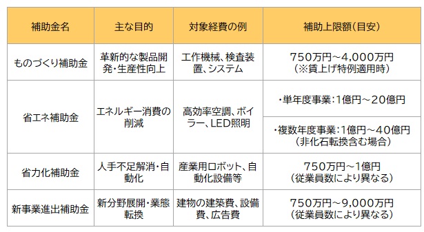 やりたいこと(設備の更新なのか、新分野への進出なのか)に合わせて選ぶことが重要です。主要な4つの制度を比較