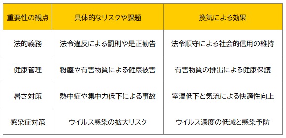 工場における換気は、単なる快適性の追求にとどまらず、企業の存続や従業員の安全に関わる重大な要素です。