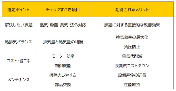コストなどを総合的に判断する必要があります。ここでは、失敗しない換気設備の選び方のポイントを解説します。