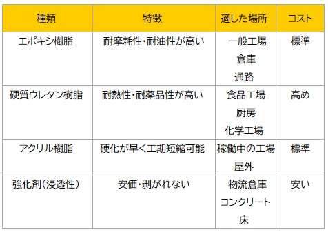 食品工場や化学薬品工場など、過酷な環境下で床を保護する必要がある場合は、少し費用が上がったとしても硬質ウレタン樹脂を選択する方が、長期的にはメンテナンスコストを抑えることにつながります。