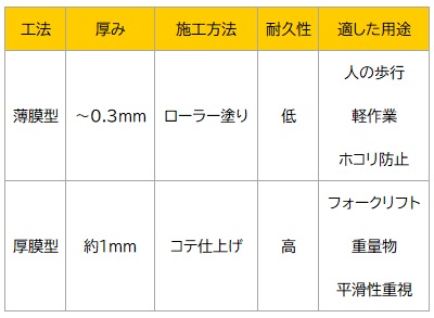 • 工法で耐久性が変わる:フォークリフト等の重荷重がある場合は、コストがかかっても「厚膜型」を選ぶべきである。